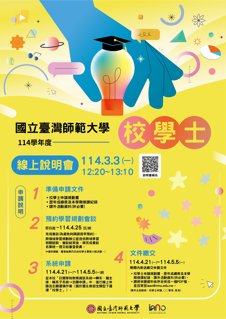 12:25 ~ 13:00 | 校學士制度及申請相關資訊 一、校學士學位簡介 二、申請流程與方式說明 三、課務與輔導 |