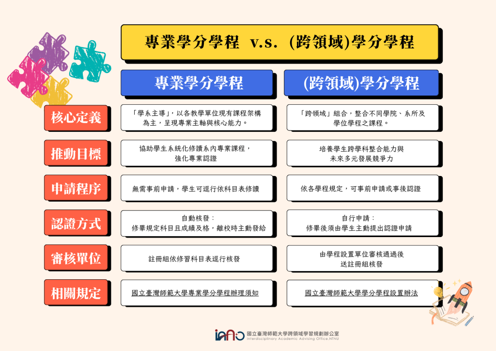 學分學程分為「專業學分學程」與「跨領域學分學程」: